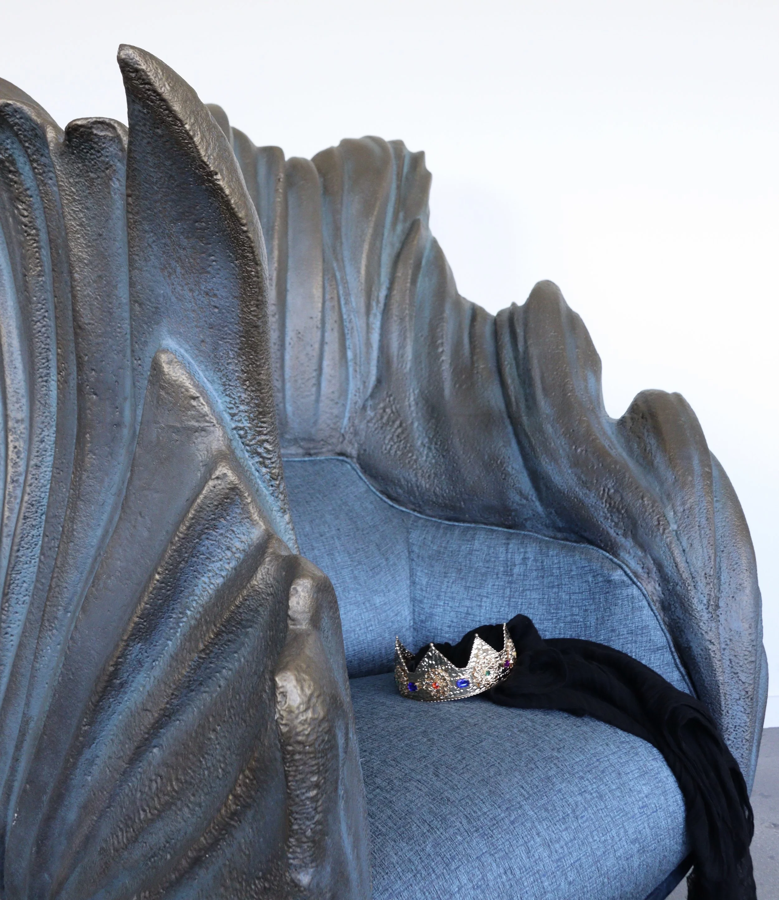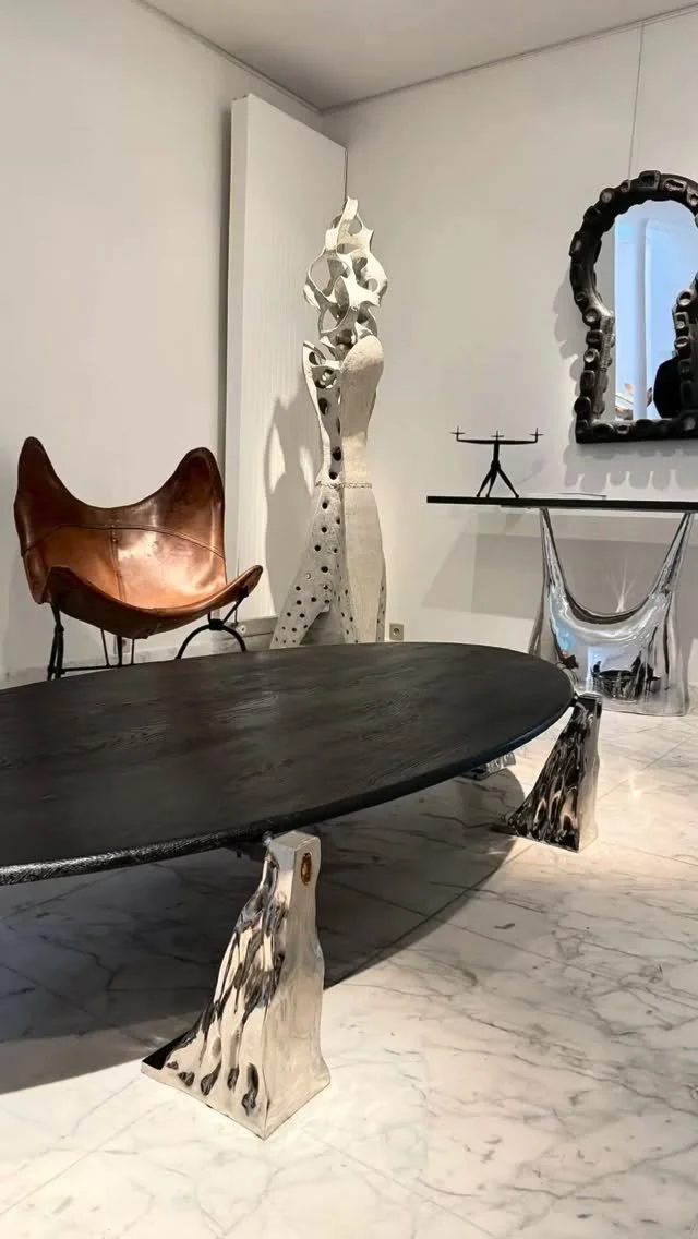 Swivel dyed Leather and cotton velvet chair with polished Stainless steal base for a suspended visual